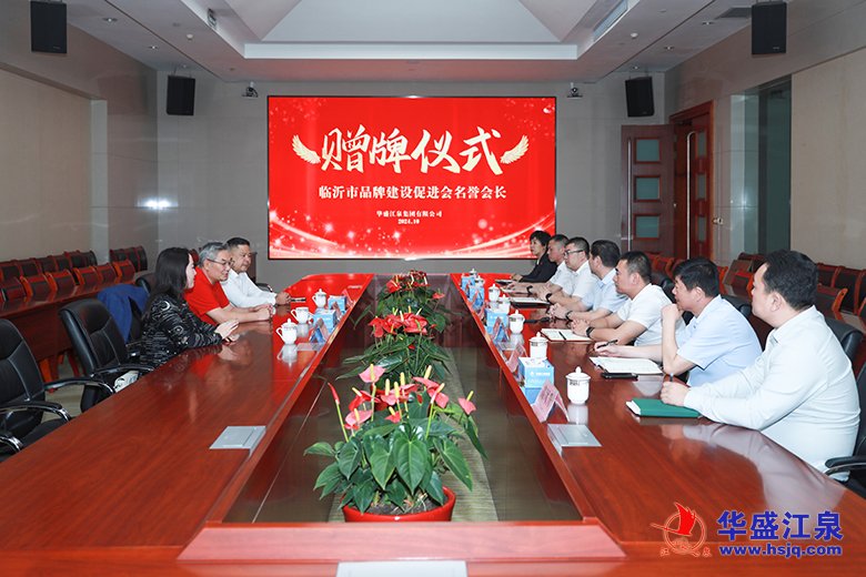 10月16日,臨沂市品牌建設促進會在集團舉行名譽會長單位贈牌儀式并進行座談交流。臨沂市政府原副市長劉賢軍,臨沂市品牌建設促進會會長胡守利、秘書長劉亦珈,華盛江泉集團黨委書記、總經理高洪路,集團高管張毅、孟濤、付冬明、林洪標,以及華盛江泉城大酒店、臨沂江泉肉制品有限公司負責人出席儀式。